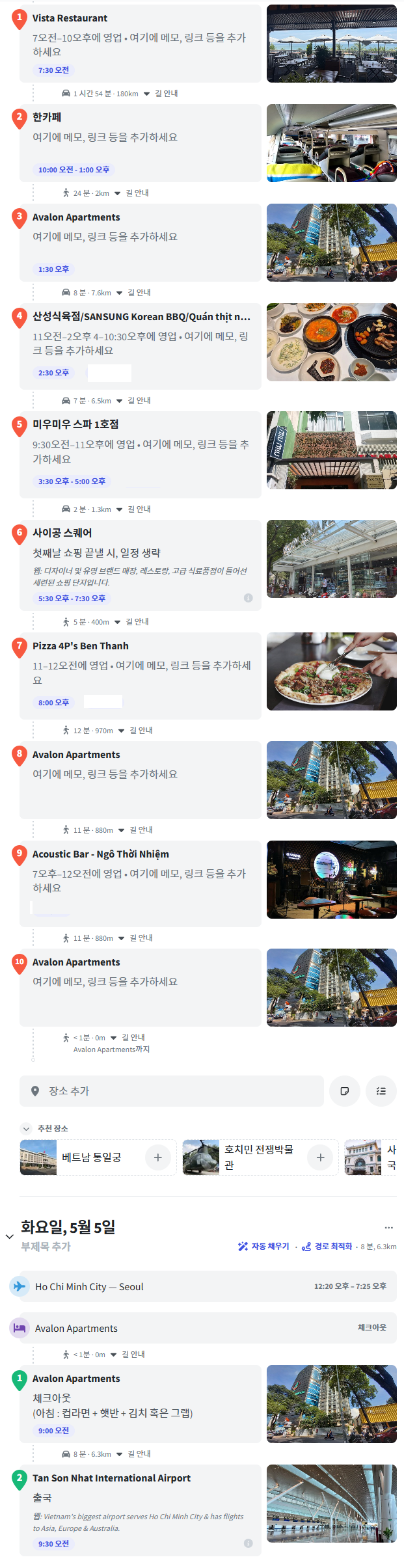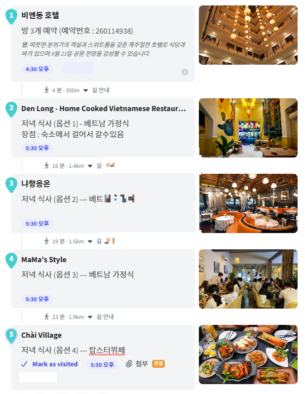 - 저녁 식사 : 여행 첫날인 만큼 베트남 현지식(냐항응온 등)으로 후보를 짜두고 부모님의 선택에 맡길 예정입니다.