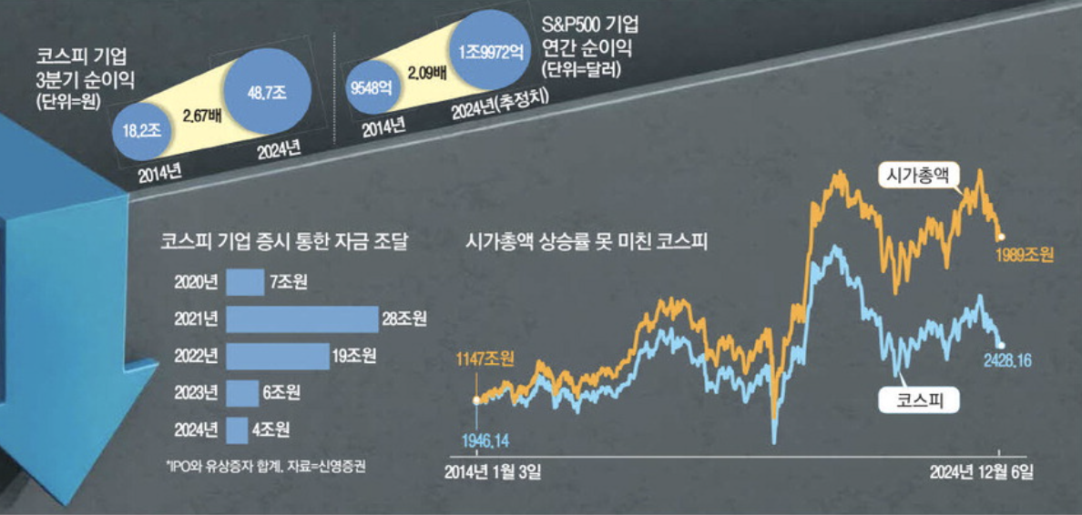 지난 10년간 코스피 기업 순이익 증가율은 미국 S&P500 기업과 유사했으나, 지수 상승률은 코스피(24.6%), S&P500(198%)로 크게 차이 남